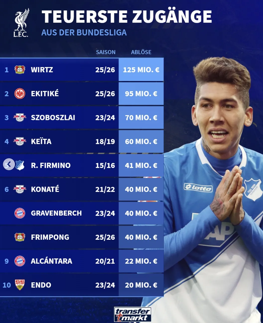 维尔茨、埃基蒂克和索博斯洛伊分别以1.25亿、9500万和7000万排名前三。来自霍芬海姆的菲尔米诺在15/16赛季花费了利物浦4100万欧排名第五。
